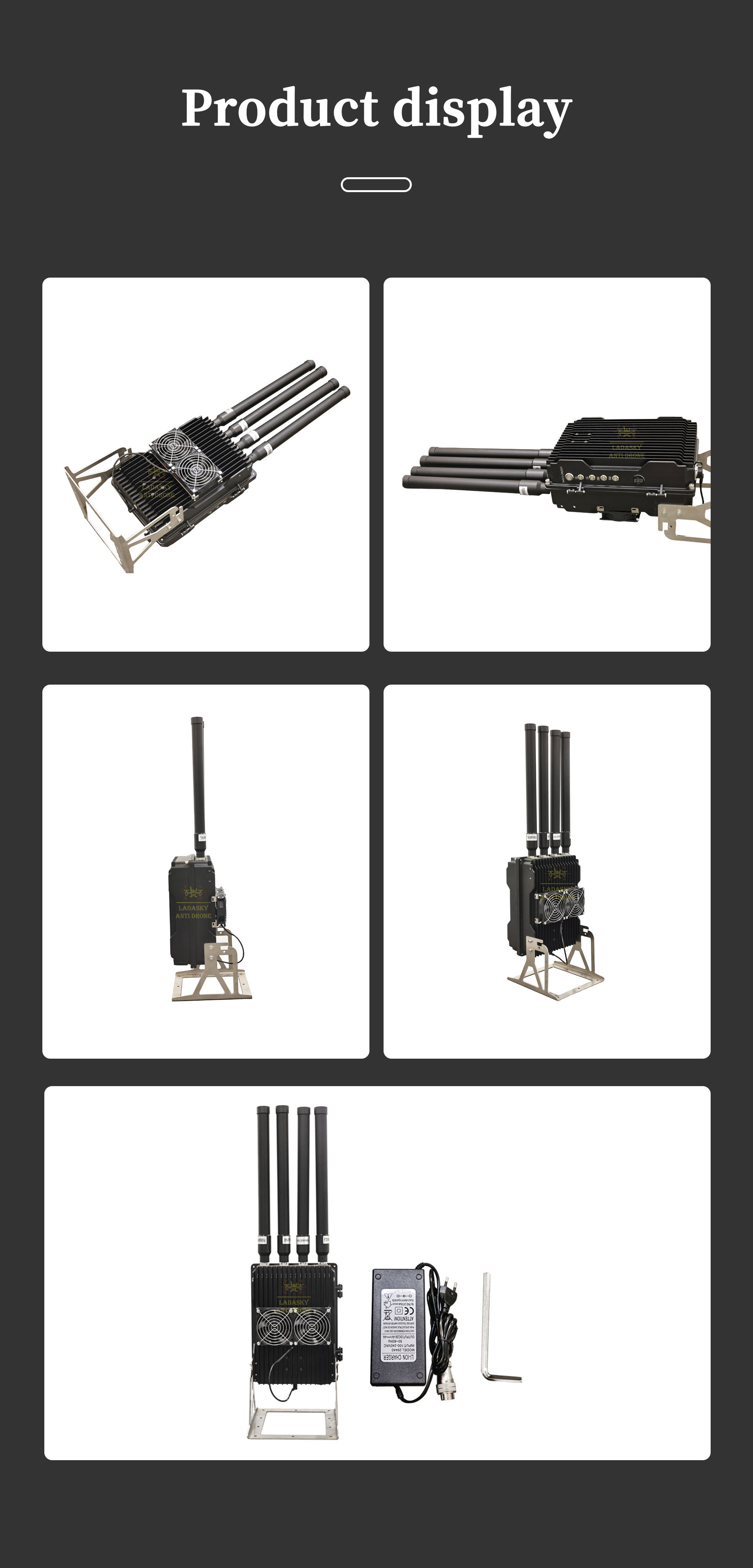 | Destacar | Sistema de contador FPV 150W,Sistema anti-FPV com antena,Sistema portátil de contador FPV |